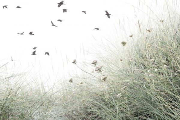 Stado ptaków leci wdzięcznie nad jasnozieloną wydmową trawą. Delikatne odcienie i lekka kompozycja promieniują spokój i wolność.