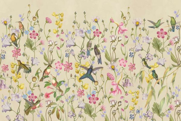 To wyrafinowany projekt łączy piękno kwitnących róż z żywotnością kolibrów, które razem tworzą harmonijną i spokojną scenę. Delikatne pastelowe kolory kwiatów są subtelnie kontrastowane przez zielone liście i neutralne tło, co wywołuje poczucie elegancji i spokoju.