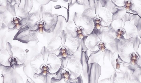 W tej bujnej kompozycji głębokie fioletowe odcienie tworzą wyraźny kontrast z jasnobiałymi orchideami. Szczegółowe płatki kwiatów zdają się błyszczeć na głębokim tle, podczas gdy subtelne liliowe akcenty w liściach i łodygach zapewniają delikatne przejście. Luksusowa i tajemnicza atmosfera fioletu doskonale nadaje się do przestrzeni, w których chcesz stworzyć poczucie elegancji i stylu, takich jak szykowny salon, jadalnia czy nawet ekskluzywne lobby hotelowe. W połączeniu z błyszczącymi metalicznymi akcesoriami, aksamitnymi poduszkami lub meblami z ciemnego drewna powstaje wyrafinowana atmosfera, która robi wrażenie. Jednak ten wzór może również dobrze wyglądać w nowocześniejszym otoczeniu, pod warunkiem, że znajdziesz odpowiednią równowagę w pozostałych kolorach. Pomyśl o neutralnych podstawowych odcieniach, takich jak biel lub szarość, aby odcienie fioletu nie były zbyt dominujące. W ten sposób całość pozostaje stylowa i zrównoważona, z orchideami jako promiennym punktem centralnym.