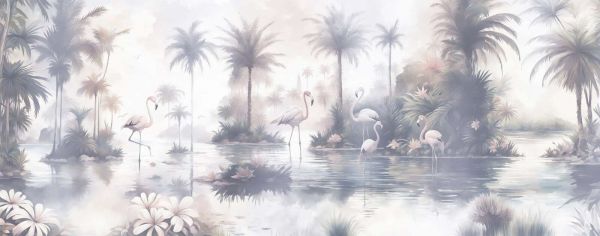 Intrygująca tropikalna sceneria w tajemniczych fioletowych i liliowych odcieniach, gdzie flamingi i egzotyczne rośliny stapiają się w niemal magicznej atmosferze. Delikatne pastelowe odcienie i subtelne akcenty świetlne nadają każdemu pomieszczeniu marzycielski i ekstrawagancki charakter.