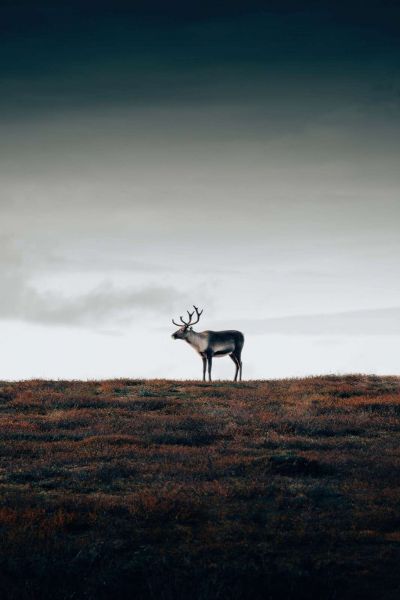 Samotna renifer stoi potężnie w rozległym, brązowo-pomarańczowym wrzosowisku pod pochmurnym niebem. Kompozycja emanuje spokojem, otwartością i naturalną wielkością, z kontrastującą grą między ciepłą ziemią a chłodnym, bladym powietrzem.