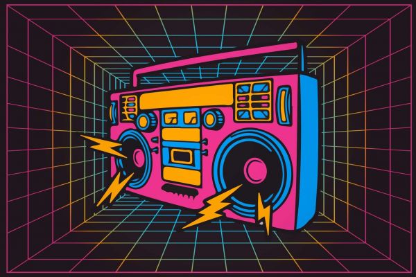 Dzięki neonowemu blasterowi w kolorze getta unoszącemu się w cyfrowej siatce, ten projekt przywołuje niezłomnego ducha lat 80-tych. Żywe kolory i geometryczne linie tworzą poczucie ruchu i oferują retro zanurzenie w czasach świetności boomboxa.