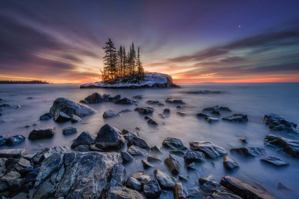 Risen na fototapecie. Piękny wschód słońca za wyspą z sosnami.