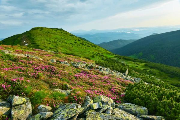 Rododendrony w górach na fototapetach. Piękny panoramiczny widok z atmosferyczną perspektywą.