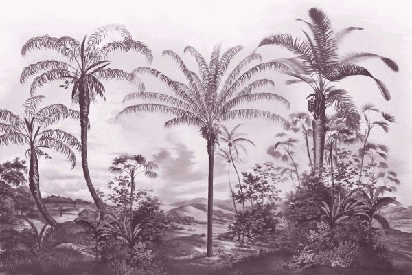 W tym tropikalnym wzorze głębokie czerwone odcienie łączą się z delikatnymi konturami palm i wzgórz, co wywołuje poczucie luksusu i wyrafinowania. Ciepłe kolory bordowe i winiacze subtelnie kontrastują z jaśniejszymi pastelami, tworząc żywą, ale harmonijną scenę.