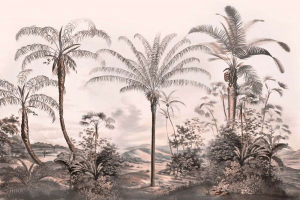 Odważne czernie i odcienie szarości tworzą w tym projekcie uderzający tropikalny krajobraz, który wydaje się zarówno nowoczesny, jak i ponadczasowy. Palmy zdają się być w sylwetce na tle subtelnej, zmierzchowej horyzonty, co nadaje intrygujący i artystyczny wygląd. To wzór idealny dla wnętrz, które cenią kontrasty i odrobinę dramatu. W eleganckim, minimalistycznym otoczeniu z gładkimi białymi ścianami i metalowymi akcentami, ten projekt ma szansę naprawdę zabłysnąć. W przemysłowym lub loftowym środowisku można go połączyć z betonem, skórą lub ciemnym drewnem, aby uzyskać surową, nowoczesną atmosferę. Ciemne kolory wprowadzają luksusowy i tajemniczy klimat, co sprawia, że ten design doskonale nadaje się na przykład do stylowego salonu lub sypialni głównej. Wykańczając go ciepłym oświetleniem, aksamitnymi poduszkami i kilkoma zielonymi roślinami, stworzysz wyrafinowaną, a jednocześnie zapraszającą całość. W ten sposób wprowadzasz tropikalną noc do wnętrza, z całą jej urodą.