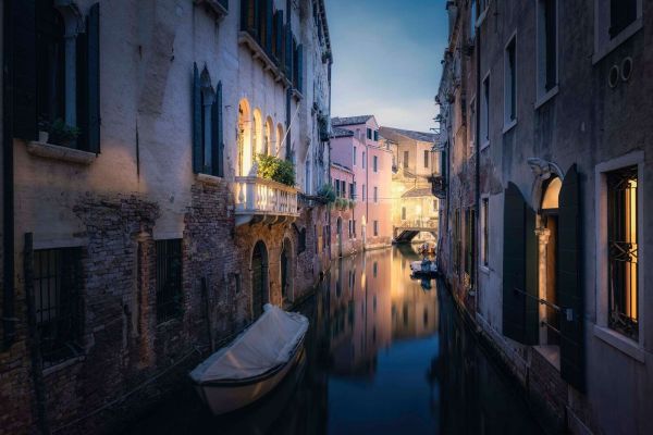 Marzycielski projekt, który uchwyca romantykę Wenecji w wieczornych godzinach. Delikatne światło z otwartych okien i balkonów odbija się w wodzie, podczas gdy historyczne fasady emanują ponadczasowym urokiem. Mieszanka ciepłych i chłodnych odcieni tworzy spokojną i nastrojową atmosferę.