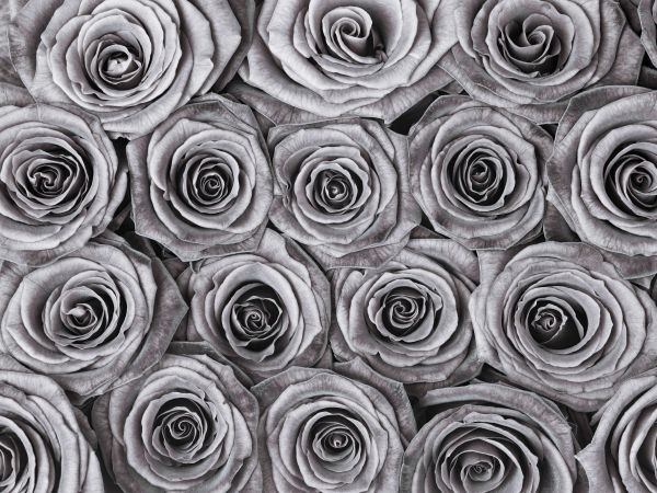 Pole róż przekształca się w paletę szarości, celebrując istotę ich formy. Delikatne gradacje światła i ciemności ujawniają aksamitną teksturę płatków i hipnotyczne wzory, które tworzą. Ten obraz zachęca do kontemplacji i podziwiania naturalnej geometrii.