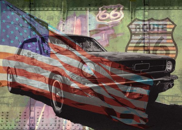 Sztuka inspirowana vintage, która łączy klasyczny samochód z ikonicznymi amerykańskimi symbolami, takimi jak znaki Route 66 i flaga Stanów Zjednoczonych. Projekt emanuje nostalgią i wolnością.