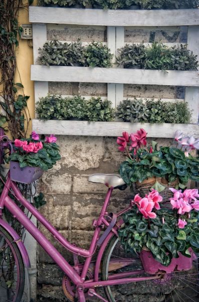 Portret fioletowego roweru z kolorowymi skrzynkami na kwiaty.
