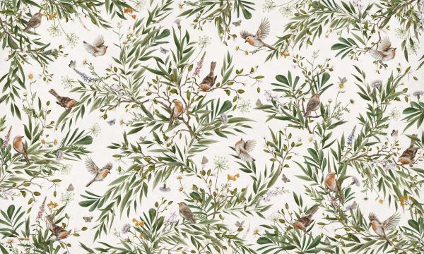 To świeże i żywe wzornictwo przenosi uczucie letniej łąki kwiatowej prosto do wnętrza. Na jasnym, prawie kremowym tle widzisz czerwonki swobodnie poruszające się między bogactwem zielonych liści, delikatnych kwiatów w białym, liliowym i pomarańczowym kolorze oraz skaczących motyli. Liście są oddane w sposób naturalistyczny w różnych odcieniach zieleni, od oliwkowej po świeżą trawiastą zielenią, co nadaje całości botaniczny i żywy charakter. Kombinacja naturalnych odcieni zieleni z ciepłymi akcentami czerwonek i kwiatów tworzy doskonale zrównoważoną całość, która promieniuje energią i spokojem. Ten styl doskonale pasuje do botanicznego lub eklektycznego wnętrza, gdzie dominują naturalne materiały, jasne ściany i rośliny. Nawet w nowoczesnym skandynawskim wnętrzu ten wzór zapewnia świeże, zabawne przełamanie bez nadmiernego chaosu wizualnego. Wzór jest bogaty, ale lekki: elementy są rozproszone w zabawny sposób i mają otwartą strukturę, dzięki czemu projekt pomimo swoich detali nigdy nie sprawia wrażenia zbyt zatłoczonego. Ptaki dodają poczucia ruchu, jakby natura była w pełnym rozkwicie i stałeś w środku słonecznego pola. Bardzo odpowiedni do przestrzeni, które potrzebują świeżości i światła: salonu, kuchni, pokoju zabaw lub nawet wejścia. Połącz ten wzór z naturalnymi materiałami, takimi jak drewno, len i ceramika. Dodatki w jasnych kolorach - myśl o szałwiowej zieleni, piasku, kremie lub pastelach - wzmacniają świeże i otwarte uczucie, tworząc zapraszającą, radosną atmosferę.