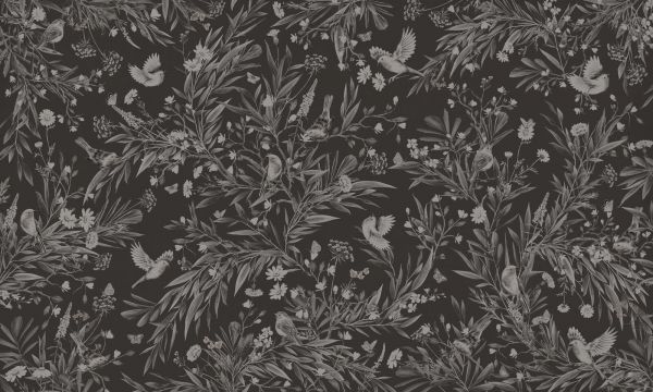 To zaczarowany projekt uchwycił spokój natury w nocy. Na głębokim czarnym tle rozwija się delikatna gra linii kwiatów, liści i małych ptaków śpiewających, przedstawionych w miękkich odcieniach szarości z subtelnie zarysowanymi kontrastami światła i cienia. Rudziki unoszą się na obrazie lub odpoczywają na gałęziach, otoczone stokrotkami, trawami, kwiatami polnymi i motylami. Całość przypomina starą botaniczną grafikę z nowoczesnym akcentem. Dzięki monochromatycznemu użyciu kolorów panuje stonowana, niemal poetycka atmosfera. Szczegółowy styl ilustracji nadaje projektowi bogactwo i głębię, nie przytłaczając. Ciemne tło nadaje projektowi elegancji i wyrafinowania, a jasne linie i kształty delikatnie się wybijają — jakby kąpane w blasku księżyca. Idealne do nowoczesnych klasycznych wnętrz lub stylowych, eklektycznych przestrzeni z głębią i charakterem. Łącz z materiałami takimi jak aksamit, ciemne drewno, marmur lub mosiądz, aby uzyskać luksusowy wygląd. Równie piękne z jaśniejszymi meblami i naturalnymi elementami, aby złagodzić kontrast. Doskonałe do sypialni, biblioteki, butikowego hotelu, urokliwej hali lub intymnego lokalu gastronomicznego. Projekt promieniuje spokojem, klasą i związkiem z naturą, idealny jako ściana z wyrazistym, delikatnym urokiem. Nocna oda dla natury — spokojna, senna i ponadczasowo piękna.