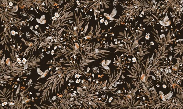 Tańczący czerwonogardły wypełniają ten bogaty i szczegółowy obraz. Na głębokim, prawie czarnym tle rozwijają się bujne gałęzie z długimi liśćmi, delikatnymi kwiatkami i białymi stokrotkami. Kolory są świadomie stonowane: delikatne odcienie brązu i beżu, przeplatane białymi akcentami oraz subtelne nuty pomarańczu i kremu. Ta stonowana kombinacja kolorów zapewnia harmonijny i ciepły wygląd, który zarówno uspokaja, jak i ożywia. To wzornictwo doskonale pasuje do wiejskiego lub klasycznego stylu wnętrz. Pomyśl o salonie z naturalnymi meblami drewnianymi, lnianymi zasłonami i vintage'owymi dodatkami - ten motyw stanowi naturalne przedłużenie takiego otoczenia. Również w boho aranżacji, połączonej z rattanem, makramą i lekkimi tkaninami, wzór pięknie ożywa. Zabawne czerwonogardłe ptaszki dodają subtelnego uczucia ruchu, podczas gdy delikatna flora utrzymuje całość lekką. Powtarzanie wzorów jest rytmiczne, ale niezbyt sztywne, co sprawia, że zachowuje ono organiczny i swobodny charakter. Dzięki użyciu ciemnego tła jaśniejsze detale kwiatów i ptaków jeszcze bardziej się wyróżniają, co tworzy elegancką głębię. Idealne do pomieszczeń, w których chcesz dodać naturalny akcent: spokojna sypialnia, przytulny kącik do czytania, urokliwa korytarz czy nawet urocze miejsce do pracy. Połącz ten motyw z kremowymi lub piaskowymi odcieniami, dodatkami w mosiądzu lub brązie oraz ciepłymi gatunkami drewna, aby uzyskać zrównoważony, ponadczasowy wygląd.
