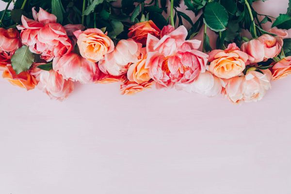 Różowa ściana ze zdjęciem róż w różnych odcieniach różu na całej szerokości.
