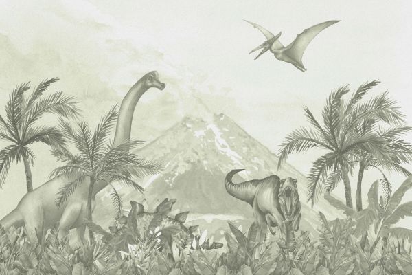 Fajny obraz z różnymi dinozaurami i wulkanem w tle w kolorze zielonym.