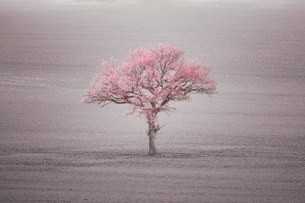 Porzucone drzewo na polu z różowymi liśćmi. Pozostała część zdjęcia jest czarno-biała.
