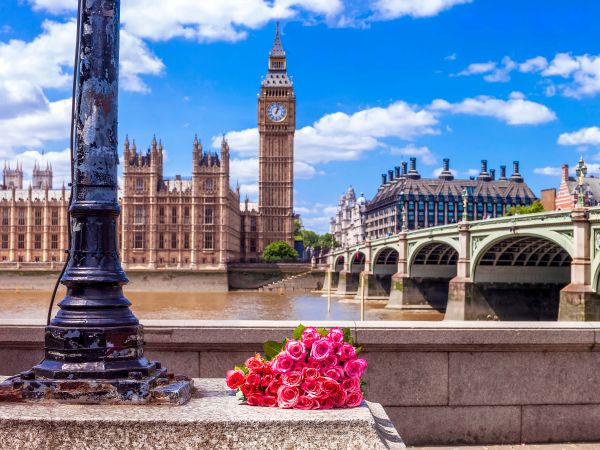 Różowe róże w Londynie. W tle widać Big Bena.