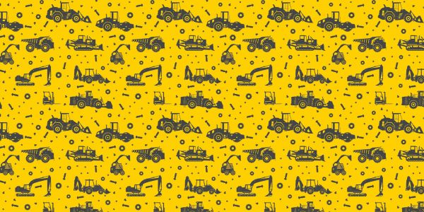 Żółta tapeta z różnymi rodzajami ruchu budowlanego, takimi jak dźwig, łopata i wywrotka. Między pojazdami, śrubami i przekładniami.