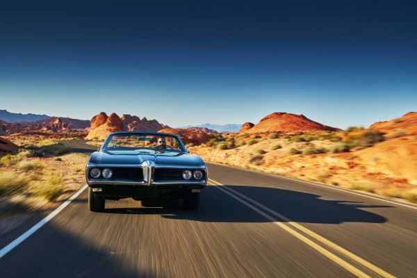 Wandkleed met een rijdende muscle car in een zonnige Amerikaanse landschap