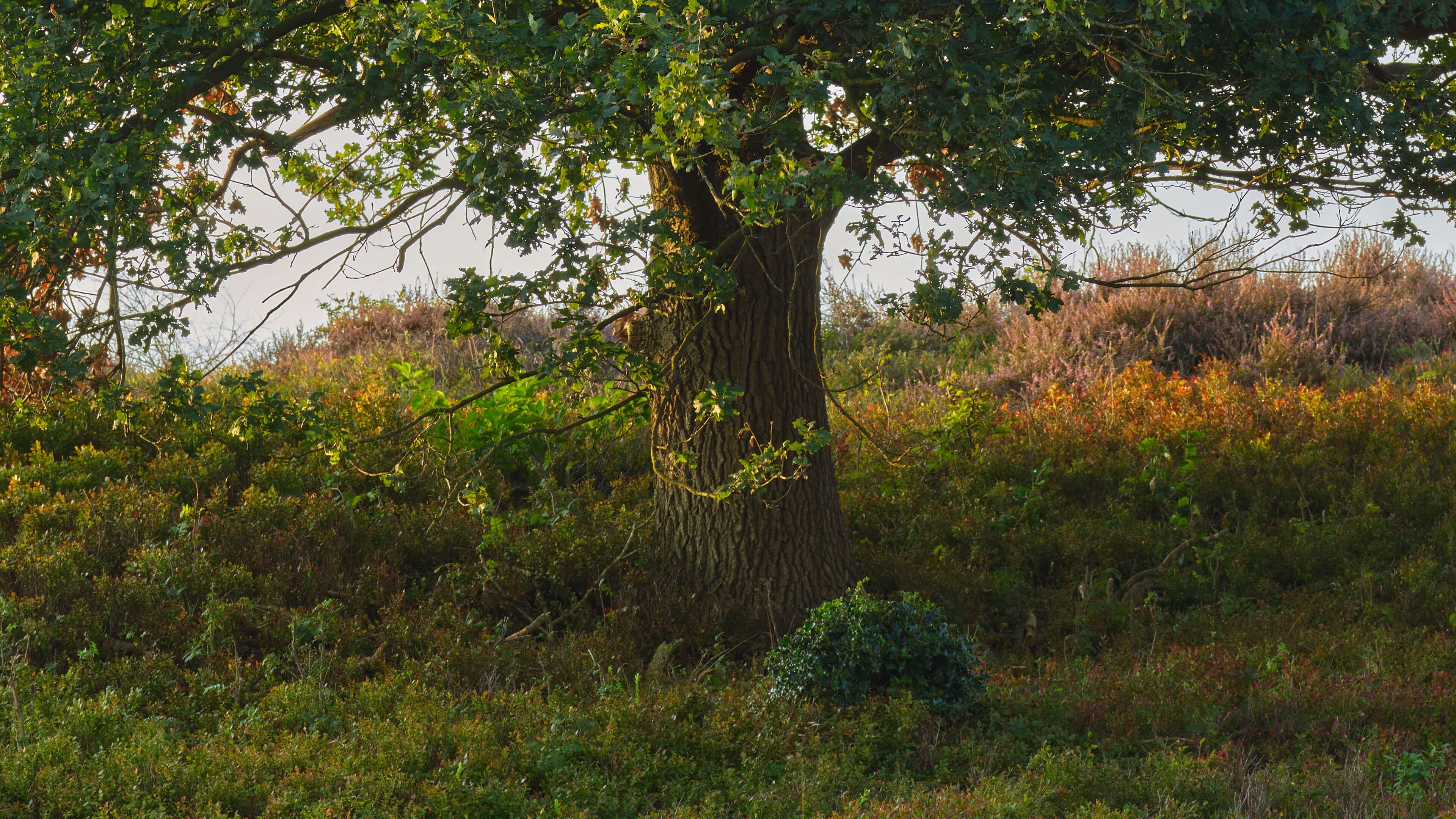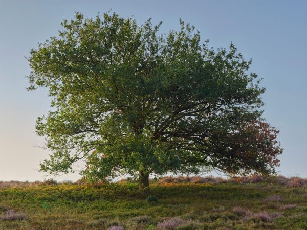 Samotne drzewo na wrzosowisku w różnych materiałach