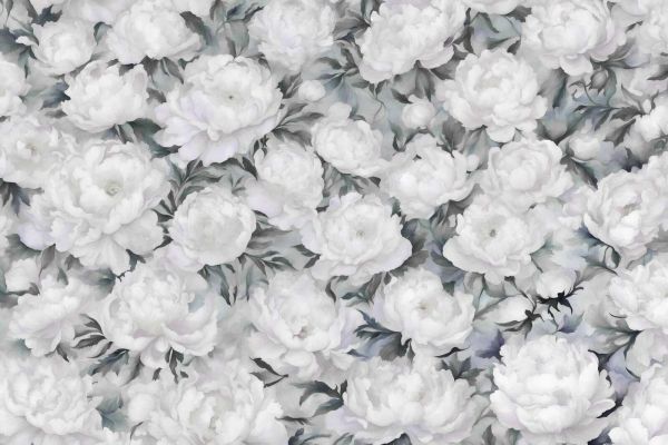 To elegancki projekt uchwyca piękno piwonii, które wydają się niemal unosić na jasnym, pastelowo-niebieskim tle. Delikatne przejścia między bielą, jasnym niebieskim a miękkimi odcieniami szarości nadają kwiatom marzycielski wygląd, podczas gdy subtelne akcenty w liściach i płatkach kwiatów zapewniają wyrafinowany poziom detali.