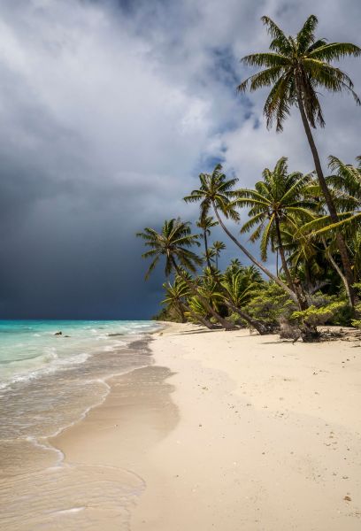 Zobacz na fototapecie nadchodzącą burzę. Plaża z palmami, czysta, błękitna woda i burza.