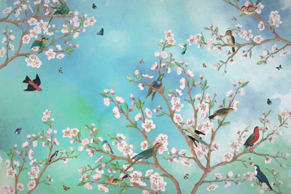 Zachwycający widok kwitnących kwiatów wiśni, otoczony kolorowymi ptakami i motylami na tle świeżego niebieskiego nieba. Delikatne detale wprowadzają poczucie wiosny i naturalnej harmonii.
