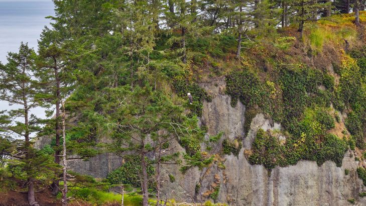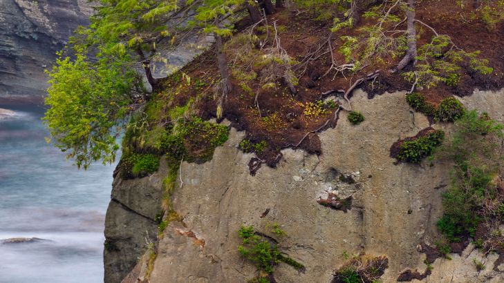Szczegółowy obraz dwóch dużych roślinnych formacji skalnych wzdłuż wybrzeża.