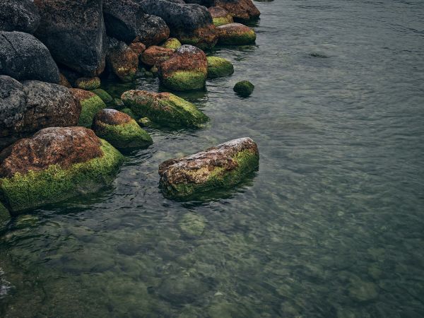 Skały nad czystym górskim jeziorem. Woda jest tak przejrzysta, że widać dno.