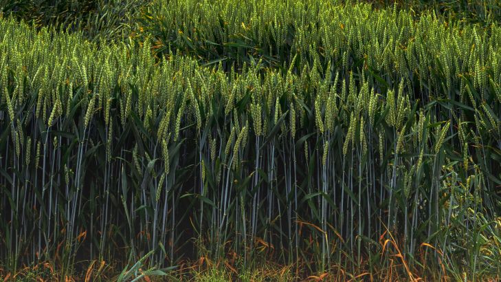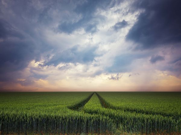 Spektakularne niebo nad polem pszenicy z ładnymi śladami na horyzoncie. Chmury wyglądają groźnie.