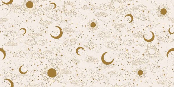 Lekka niebiańska scena z wdzięcznymi słońcami, półksiężycami, gwiazdami i zwiewnymi chmurami w złocie na miękkim kremowym tle. Całość emanuje spokojem, magią i wyszukaną elegancją.