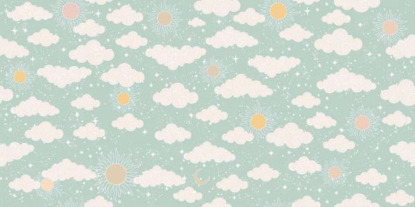 Radosny wzór nieba z miękkimi chmurkami, słońcami, księżycami i migoczącymi gwiazdkami w pastelowych odcieniach na miętowym tle. Projekt emanuje spokojem, życzliwością i wyobraźnią.