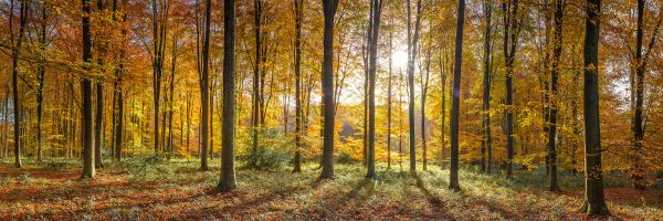 Słoneczny jesienny dzień w lesie. Liście drzew są pięknie ubarwione.