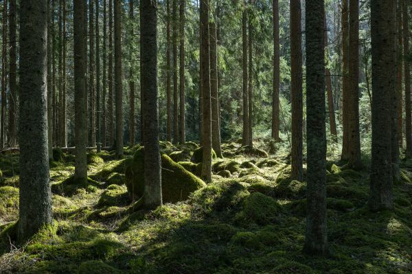 Słoneczny poranek w naturalnym lesie świerkowym z omszałymi zielonymi głazami.