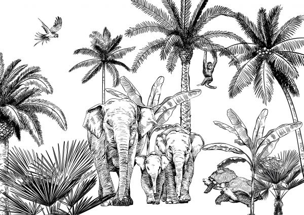 Słoń i jego przyjaciele z dżungli w lesie. Hip i Trendy tapeta do pokoju dziecięcego.
