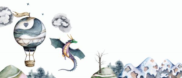 Magiczny akwarelowy świat z latającym smokiem, balonem na ogrzane powietrze i górzystym lasem.