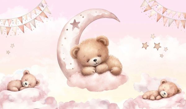 Kochane pluszowe misie marzą spokojnie na miękkich różowych chmurach, podczas gdy jeden przytulnie leży na ozdobnym księżycu. Pastelowe kolory, migoczące gwiazdki i figlarne flagi tworzą marzycielską i uspokajającą atmosferę.