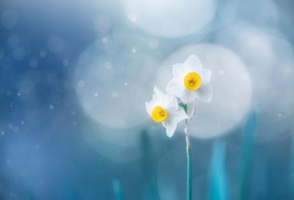 Zbliżenie na dwa białe kwiaty na niebieskim tle.