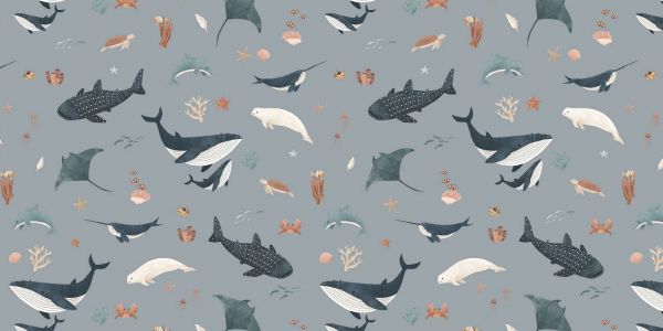 Wesoły podwodny wzór z życiem morskim, takim jak wieloryby, manty, delfiny i żółwie morskie, wśród kolorowych koralowców i rozgwiazd. Delikatne tło i zabawne ilustracje wprowadzają spokojną i przygodową atmosferę, idealną do stworzenia żywego akcentu w każdej przestrzeni.