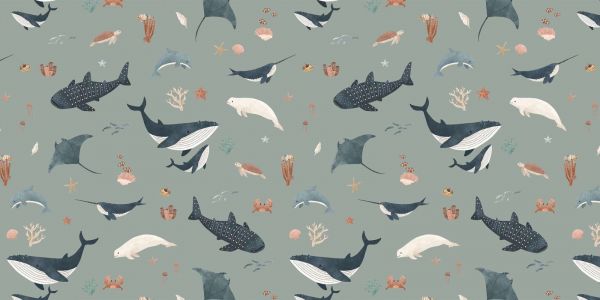 Wesoły podwodny wzór z życiem morskim, takim jak wieloryby, manty, delfiny i żółwie morskie, wśród kolorowych koralowców i rozgwiazd. Delikatne tło i zabawne ilustracje wprowadzają spokojną i przygodową atmosferę, idealną do stworzenia żywego akcentu w każdej przestrzeni.