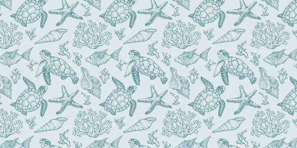 Żółwie morskie spokojnie unoszą się wśród wodorostów i koralowców w tym czarującym niebieskim wzorze. Spokojny rytm powtórzeń wywołuje uczucie pokoju, hołd dla serenicznej i nienaruszonej ciszy dna morskiego.