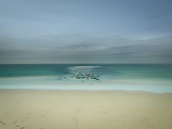 Spokojne morze z mewami wśród zanurzonych w wodzie łamańców skalnych. Połącz tę fototapetę na przykład w salonie.