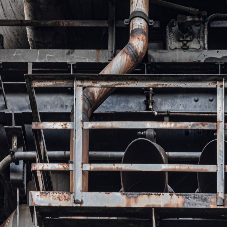Stara i opuszczona fabryka przemysłowa z zardzewiałymi elementami.