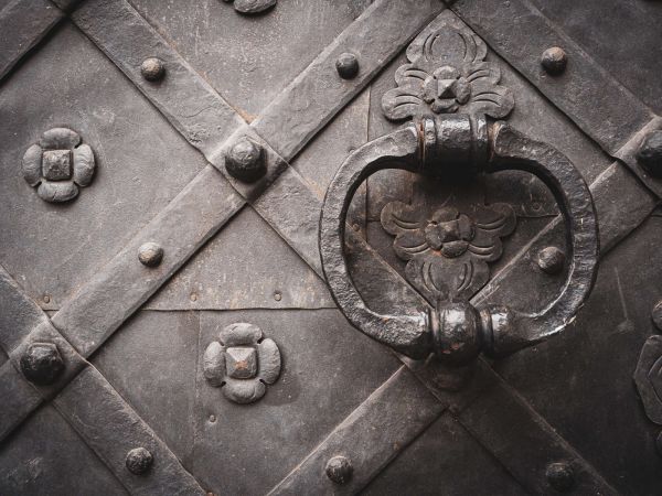 Zbliżenie starych stalowych drzwi zamku z dużą klamką.