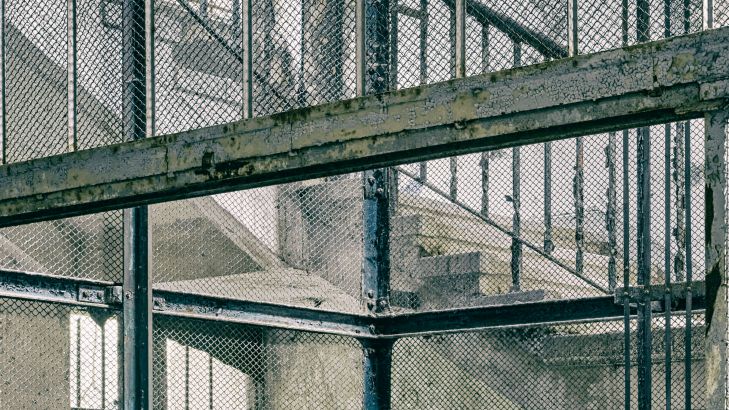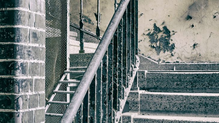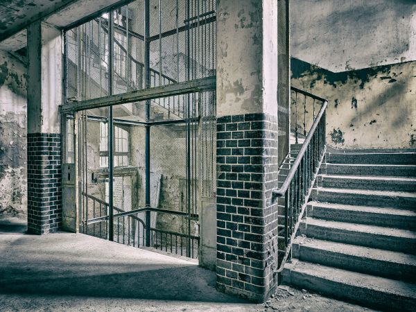 Piękny stary szyb windowy z klatką schodową. Z tą fototapetą w Twoim pokoju, to tak jakbyś mógł wejść po schodach.