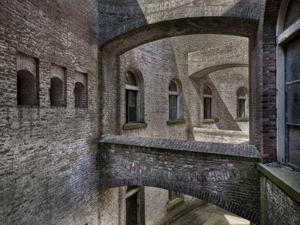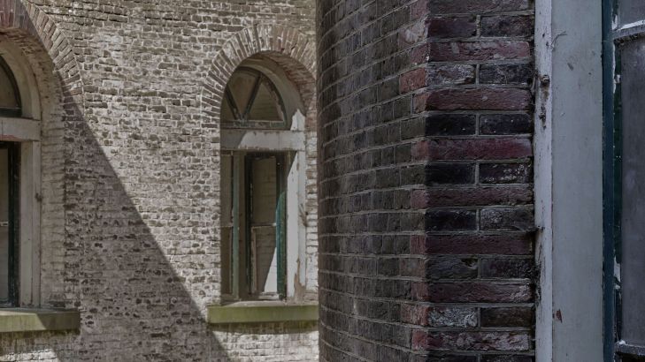 Oświetlony słońcem stary budynek z kilkoma pięknymi kamiennymi łukami.