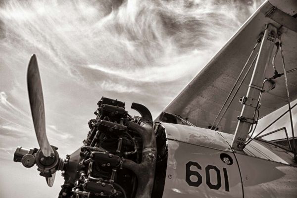 Szczegółowa czarno-biała kompozycja klasycznego samolotu z silnikiem śmigłowym na tle dynamicznej warstwy chmur. Potężne połączenie techniki, nostalgii i lekkiego ruchu powietrznego.