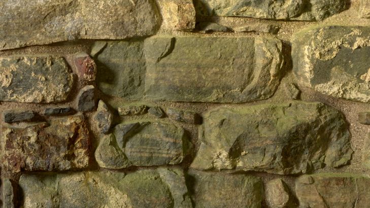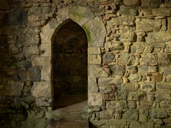 Stary średniowieczny mur z wąskim przejściem.