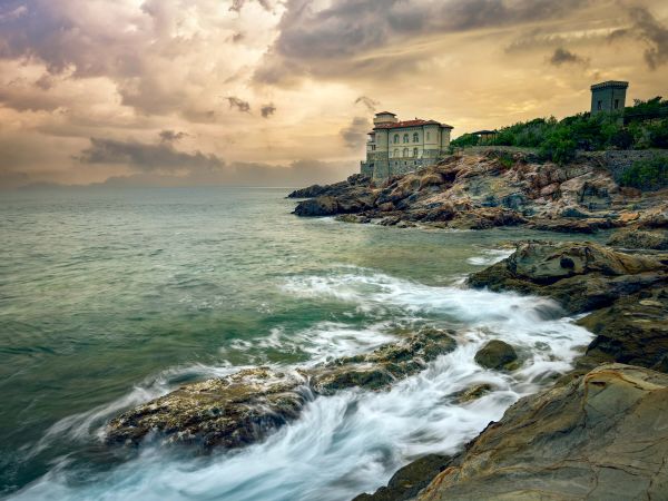 Starożytny zamek na wybrzeżu Włoch. W tle szaleją burze. Połącz tę fototapetę na przykład w przedpokoju.