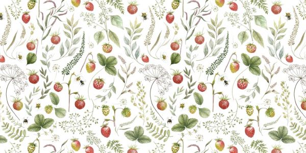 Żywy wzór z dojrzałymi truskawkami, liśćmi i kwiatami, w towarzystwie figlarnych pszczół, na białym tle. Szczegółowe ilustracje i świeże kolory nadają letni i naturalny wygląd, idealny do dodania radosnego i figlarnego akcentu do każdej przestrzeni.